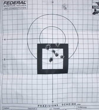 There were stepped ranges, you had to change tables to change range, so we decided to split the difference and do 50 so we could shoot both pistol and rifle. So the group with the M1 is not very impressive, but the one from the 10-mm S&W is.
